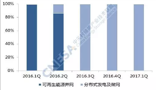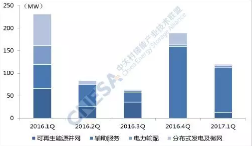 從應(yīng)用分布上看,投運(yùn)項(xiàng)目在輔助服務(wù)領(lǐng)域的裝機(jī)規(guī)模最大,為99.1MW,同比增長87%,環(huán)比2016年四季度下降38%。