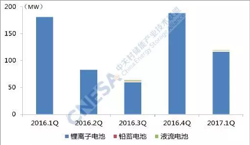 從技術(shù)分布上看,投運(yùn)項(xiàng)目中,鋰離子電池的裝機(jī)規(guī)模最大,為117.1MW,同比下降35%,環(huán)比2016年四季度下降38%。