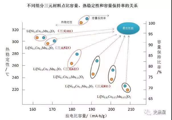 三元正極材料通過NiCo-Mn/Al的協(xié)同作用,結(jié)合了鈷酸鋰循環(huán)性能好,鎳酸鋰高比容量和錳酸鋰成本低安全性能好的優(yōu)點(diǎn)。在三元材料的各個(gè)組分中鎳決定電量,鈷決定充放電速度,錳決定穩(wěn)定性,隨著鎳含量的增加,電池的放電比容量也隨之增加,熱穩(wěn)定性和容量保持率有所降低,但隨著三元電池安全性得到提高與工藝演進(jìn),更高鎳三元材料是大勢所趨。