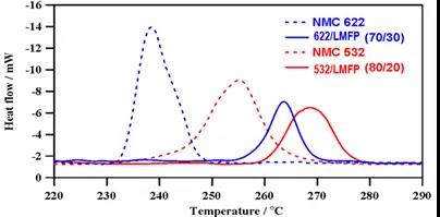 三元+LMFP的作法已被許多電池廠認(rèn)證,三元混摻20%~30%LMFP的復(fù)合材料與純?nèi)牧舷啾?,熱分解溫度提?~10%且放熱量降低40~60%(如圖一所示),證實(shí)可從材料的本質(zhì)徹底解決三元一直以來存在的安全問題,動(dòng)力電池產(chǎn)業(yè)如今要從523轉(zhuǎn)向安全疑慮更高的622及811,若只靠政策的松綁,終究是不能解決安全的問題。此問題一日未解,始終會(huì)是一顆未爆彈,SONY、三星的慘痛代價(jià)仍記憶猶新,作為企業(yè)的領(lǐng)導(dǎo)者不得不謹(jǐn)慎以對(duì)。