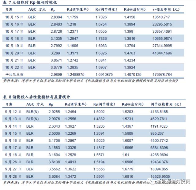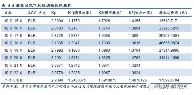由于目前國內(nèi)對儲能調(diào)頻效果及經(jīng)濟(jì)性的測算缺乏統(tǒng)一標(biāo)準(zhǔn),因此根據(jù)清華大學(xué)電機(jī)系劉紅衛(wèi)的碩士畢業(yè)論文《電池儲能系統(tǒng)與火電機(jī)組聯(lián)合調(diào)頻的性能及經(jīng)濟(jì)性分析》中石景山的項(xiàng)目數(shù)據(jù),我們得到儲能和火電機(jī)組聯(lián)合調(diào)頻的效果及經(jīng)濟(jì)性相關(guān)評價(jià)。