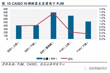 實(shí)際上隨著新能源的占比的不斷上升,實(shí)際需求還將會更高。以加州為例,由于風(fēng)光的大量接入,2016年CAISO增加了2月~6月調(diào)頻需求量(一般增加到600MW,在2月底~3月初增加到800MW),總需求量是同期的近兩倍,而這段時間內(nèi)的調(diào)節(jié)成本同比上漲了6倍,這體現(xiàn)了調(diào)頻巨大的經(jīng)濟(jì)效益。2016年加州總裝機(jī)量達(dá)7902.6萬千瓦,其中風(fēng)電占比7.1%,太陽能占比12.5%,相比之下PJM總裝機(jī)量達(dá)1.82億千瓦,而風(fēng)電只占0.6%,太陽能占比只有0.1%。反應(yīng)在調(diào)頻需求上加州的調(diào)頻需求是峰值容量的0.9%,最高峰時可達(dá)1.7%,而PJM只有0.3%~0.5%。