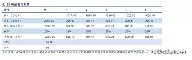 調(diào)頻經(jīng)濟(jì)性遠(yuǎn)好于削峰填谷。因此根據(jù)清華大學(xué)電機(jī)系劉紅衛(wèi)的碩士畢業(yè)論文《電池儲能系統(tǒng)與火電機(jī)組聯(lián)合調(diào)頻的性能及經(jīng)濟(jì)性分析》中石景山的項(xiàng)目數(shù)據(jù),我們得到儲能和火電機(jī)組聯(lián)合調(diào)頻的效果及經(jīng)濟(jì)性相關(guān)評價(jià)。石景山項(xiàng)目總投資2260萬元,其中電池為1200萬元,PCS為600萬元,施工費(fèi)用460萬元,我們假設(shè)設(shè)備殘值為5%,根據(jù)以上假設(shè)我們進(jìn)行投資回收期測算,在第5年時NPV即可為正,IRR可達(dá)到11%,體現(xiàn)了調(diào)頻項(xiàng)目具有非常好的投資前景。由此我們可以看出調(diào)頻的經(jīng)濟(jì)性遠(yuǎn)超削峰填谷,而未來隨著新能源在電源中占比的進(jìn)一步提高,以及電力市場進(jìn)一步深化,開放輔助服務(wù)市場,調(diào)頻的需求也將進(jìn)一步釋放,因此我們認(rèn)為調(diào)頻將會成為一個競爭激烈的市場。此外還可以將同一儲能應(yīng)用到不同的場景中,通過多種場景疊加來獲得更多的收益,從而進(jìn)一步縮短投資回收期。