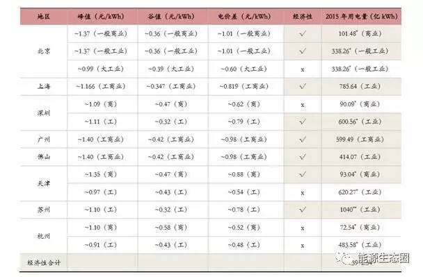 特別是部分工商業(yè)發(fā)達(dá)的大型城市,統(tǒng)計(jì)了國內(nèi)大型城市的峰谷電價差,根據(jù)目前鉛炭儲能最 低 0.5 元左右的度電成本,電價差大于 0.8 元/kWh 的地區(qū)都有經(jīng)濟(jì)性,這些地區(qū)對應(yīng)的 2015 年用電量合計(jì)約 為 3972.54 億 kWh,若其中 10%的用電量通過儲能來進(jìn)行削峰填谷,大約需要 1.2 億 kWh 的儲能設(shè)備(其容量對應(yīng)日 充放電量) ,若按鉛炭儲能每 kWh 約 1250 元的投資額計(jì)算,則對應(yīng)累計(jì)市場規(guī)模 1500 億元;若按鋰電儲能每 kWh 約 2000 元(考慮未來五年成本有望明顯下降)的投資額計(jì)算,則對應(yīng)累計(jì)市場規(guī)模 2400 億元。