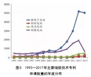圖5為1993-2017年主要儲能關鍵技術專利申請數(shù)量年度變化圖,如圖所示,進入21世紀之前,鉛酸電池技術的專利產出明顯高于其他三種儲能技術,直到2003年被鋰離子電池超越。從年度專利變化來看,鋰離子電池的專利產出在2008年后開始大幅增長,專利數(shù)量遙遙領先其他電池技術,成為最熱儲能技術。