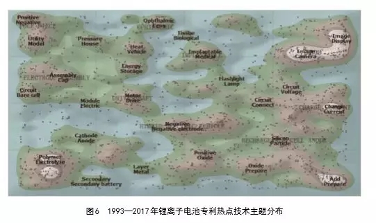 利用ThomsonInnovation平臺的專利地圖功能,結合專利分類號的分析,我們對鋰離子電池、鈉硫電池、液流電池及鉛酸電池專利技術熱點進行了分析。圖6為鋰離子電池的專利熱點技術地圖,可以看出,鋰離子電池專利的熱點技術主題包括:(1)聚合物電解質;(2)正極、負極氧化物材料研究;(3)儲能、電動汽車及圖像處理技術應用;(4)充放電研究;
