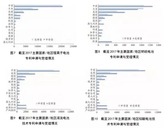在鋰離子電池領域,中國、日本、美國、韓國、德國為主要專利產出國,其中中國專利申請量大幅領先(如圖7所示)。在鈉硫電池領域,日本專利數(shù)量處于絕對領先地位(如圖8所示);液流電池領域,中國、日本和美國三國專利占到全球申請總量的80%以上,中國排名首位(如圖9所示);鉛酸電池領域,日本、中國、美國三國的專利申請數(shù)量占全球申請總量的90%,日本排名首位(如圖10所示)。