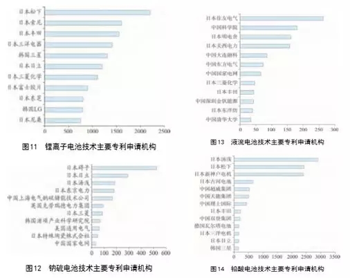 儲能關鍵技術領域,日本企業(yè)具有較大領先優(yōu)勢。鋰離子電池領域,松下、索尼、豐田和三洋排名前四位(圖11所示);鈉硫電池領域,礙子(NGK)、日立、湯淺、東京電力排名前4位,中國上海電氣鈉硫儲能技術公司排名第5位(圖12所示);液流電池領域,日本住友、中國科學院、日本明電舍、日本關西電力、中國大連融科排名前5位(圖13所示);鉛酸電池領域,日本湯淺、松下、新神戶和古河電池專利申請量排名前4位,中國超威、天能、理士國際排名5-7位(圖14所示)。