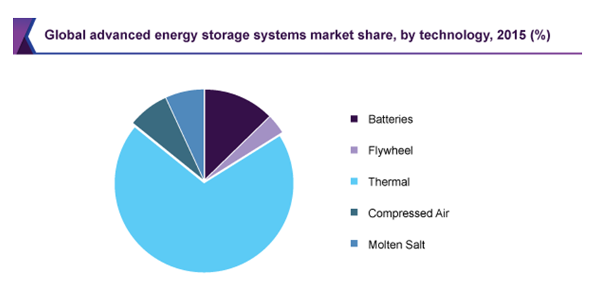 全球儲(chǔ)能系統(tǒng)市場(chǎng)可以按技術(shù)和地區(qū)分類(lèi)。在技術(shù)方面,其進(jìn)一步細(xì)分為飛輪、壓縮空氣、熱儲(chǔ)能、蓄電池、熔鹽等儲(chǔ)能市場(chǎng)。熱儲(chǔ)能技術(shù)在2014年引領(lǐng)全球市場(chǎng)的發(fā)展,占產(chǎn)能總量份額的70.8%。由于高可靠性、高效率和更長(zhǎng)的使用壽命,飛輪技術(shù)具有巨大的發(fā)展?jié)摿?。另一方面,蓄電池預(yù)計(jì)將成為增長(zhǎng)最快的技術(shù)領(lǐng)域。預(yù)計(jì)到2022年,復(fù)合年增長(zhǎng)率將達(dá)到近18%。