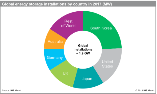 與調(diào)研機(jī)構(gòu)GTM Research公司最近發(fā)布的2017年報(bào)告不同,HIS公司去年將韓國而不是美國認(rèn)定為儲(chǔ)能部署最多的國家級(jí)市場之一。下圖顯示了HIS公司如何細(xì)分全球儲(chǔ)能部署的市場份額。