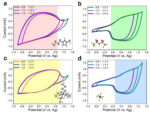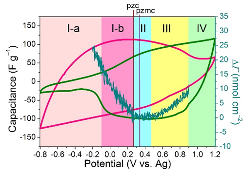 基于以上方法,研究團隊發(fā)現(xiàn),以商用活性炭YP-50F為電極,可以表征陽離子BMIM+、NBu4+和陰離子NTf2–、PF6–各自貢獻的容量以及每種離子貢獻容量的特定電壓窗口。使用石英晶體微天平(EQCM),研究人員進一步表征了活性炭YP-50F在離子液體(BMIM-NTf2)的儲能機理,并結(jié)合BMIM+和NTf2–各自的電化學性質(zhì),對儲能機理進行了更深層次的解釋。