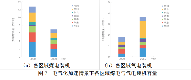 圖8 電氣化加速情景下各區(qū)域風電與光伏發(fā)電裝機容量