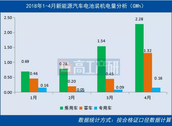 中國(guó)儲(chǔ)能網(wǎng)訊:高工產(chǎn)業(yè)研究院(GGII)最新數(shù)據(jù)統(tǒng)計(jì)顯示,2018年4月我國(guó)新能源汽車(chē)生產(chǎn)約8.7萬(wàn)輛,同比增長(zhǎng)148%,動(dòng)力電池裝機(jī)總電量約3.76GWh,同比增長(zhǎng)304%。