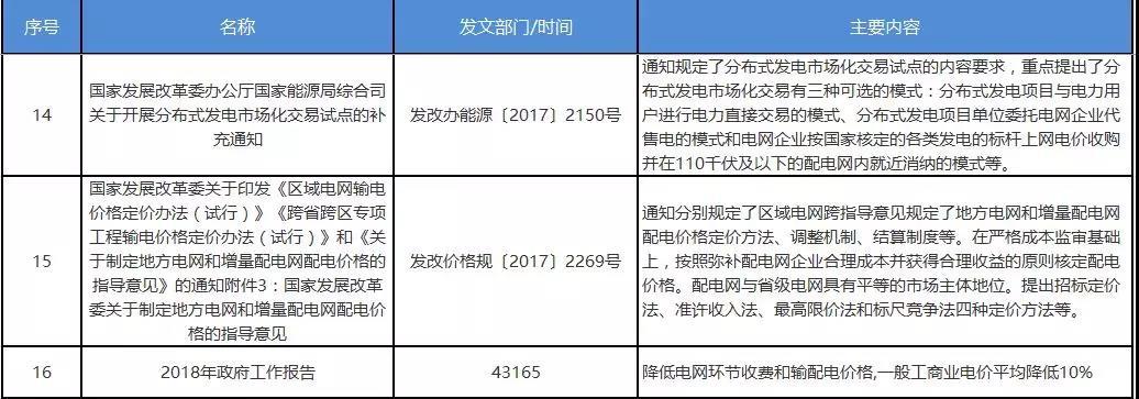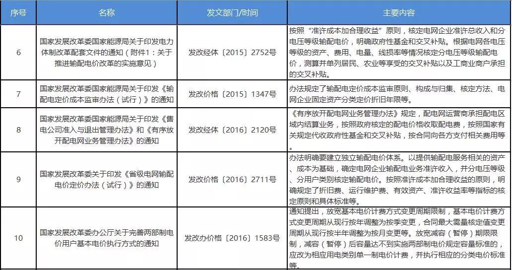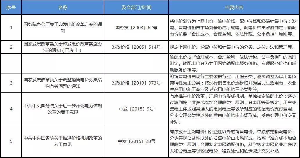 1.輸配電價(jià)改革正按照“管住中間、放開(kāi)兩頭”的電價(jià)改革總體思路不斷深化?!秶?guó)務(wù)院辦公廳關(guān)于印發(fā)電價(jià)改革方案的通知》(國(guó)辦發(fā)〔2003〕62號(hào))明確規(guī)定了輸配電價(jià)改革的原則和方向,給后續(xù)政策制定奠定了堅(jiān)實(shí)基礎(chǔ)?!吨泄仓醒雵?guó)務(wù)院關(guān)于進(jìn)一步深化電力體制改革的若干意見(jiàn)》(中發(fā)〔2015〕9號(hào))進(jìn)一步將電價(jià)改革作為首要任務(wù),明確提出單獨(dú)核定輸配電價(jià),按“準(zhǔn)許成本加合理收益”原則,分電壓等級(jí)核定等要求。