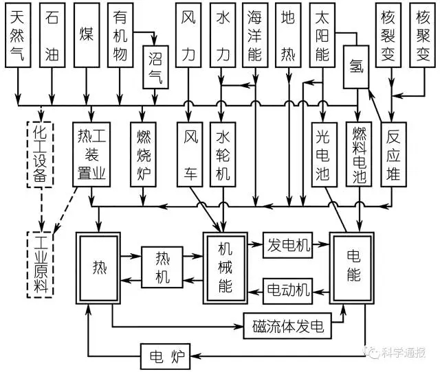 20世紀(jì)80年代初, 在對(duì)能源利用的核心科學(xué)問(wèn)題進(jìn)行全面深入地綜合與總結(jié)后, 吳仲華提出了基于熱能品位概念的“溫度對(duì)口、梯級(jí)利用”理念, 作為普遍適用的熱能利用原理, 對(duì)能源動(dòng)力的發(fā)展應(yīng)用具有重要的意義。他通過(guò)圖1來(lái)表示各種能源經(jīng)過(guò)各種設(shè)備轉(zhuǎn)化為各種不同形式的能來(lái)使用的情況。他認(rèn)為在開發(fā)利用能源時(shí), 要認(rèn)真比較各種能源的優(yōu)缺點(diǎn), 對(duì)各種能源的品質(zhì)很好地加以綜合考慮; 現(xiàn)代科學(xué)技術(shù)的發(fā)展將為較大幅度地提高能源利用率提供可能性和多樣性, 但都必須重視基于能的品位概念的梯級(jí)利用理念。