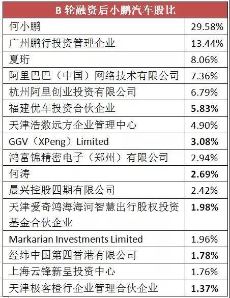 在A輪融資之前,小鵬汽車(廣州橙行智動汽車科技有限公司)的資金以何小鵬等創(chuàng)始團隊和天使投資為主。何小鵬也參與后續(xù)融資,因此他的股比還增長了,達到43.6%之多。A1和A2輪開始,諸多機構(gòu)加持小鵬汽車,到了B輪,更有IDG等知名投資機構(gòu)現(xiàn)身。在B輪之后,如果小鵬在2018年春節(jié)前所說的“會在今年過年前完成 50 億左右的融資”,此時總?cè)谫Y規(guī)模為50億左右。