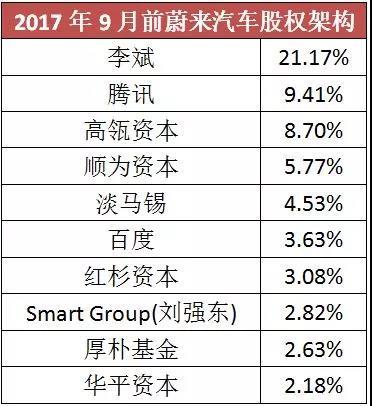 蔚來汽車公開對外的公司是上海蔚來汽車有限公司,但該公司由設在開曼群島的NIO NEXTEV LIMITED 100%控股,因此很難查到詳細投資信息。根據(jù)一份2017年9月的融資文件,蔚來汽車的出資方多且分散,經(jīng)過六七輪、總?cè)谫Y已經(jīng)超過150億元,至今股東超50家。