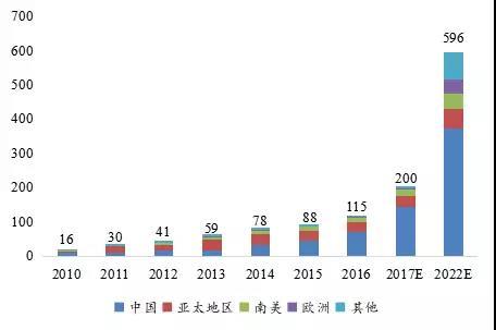 2011-2017年全球不同類型鋰電池出貨量(GWh)