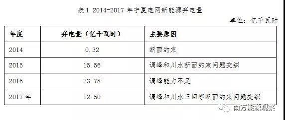 2014年5月寧夏電網(wǎng)首次出現(xiàn)電網(wǎng)斷面引起的新能源棄風(fēng),全年棄風(fēng)電量0.32億千瓦時,棄電率0.49%。進入2015年后,因新能源裝機超過了電網(wǎng)的全額接納能力,3月份首次出現(xiàn)因調(diào)峰能力不足的棄風(fēng),9月份首次出現(xiàn)棄光,調(diào)峰和斷面棄電問題交織,全年棄電15.56億千瓦時,棄電率11.84%。2016年棄風(fēng)棄光成為電網(wǎng)運行新常態(tài),全年棄風(fēng)棄光23.78億千瓦時,棄電率11.61%。