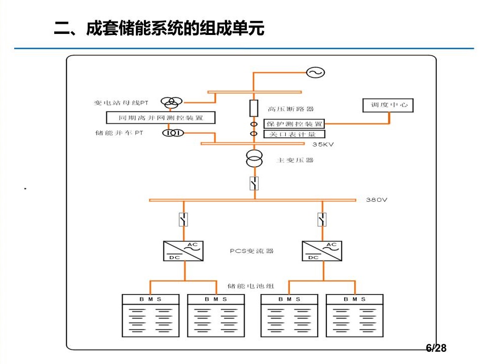 成套儲能系統(tǒng)組成單位,大家已經(jīng)聽過好多報告,也基本上都了解了,我再簡單重復(fù)一下。首先,它是必須有電池組,電池組的核心部件也是那個成本最高的。電池組本身需要一個BMS的管理單元;儲能變流器要實現(xiàn)電池直流電轉(zhuǎn)換成交流電;同期離并網(wǎng)保護(hù)測控裝置;儲能監(jiān)控系統(tǒng)平臺;關(guān)口計費(fèi)系統(tǒng);升壓變壓器;接入間隔高壓斷路器;接入間隔保護(hù)測控裝置。
