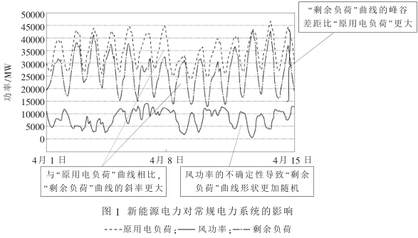 確保安全、高質(zhì)量供電,同時(shí)維持電力供需平衡是電力系統(tǒng)面臨的持續(xù)挑戰(zhàn)。社會(huì)的用電需求是實(shí)時(shí)變化的,晝夜和季節(jié)性用電負(fù)荷存在峰谷差,而電力供需平衡的常規(guī)調(diào)節(jié)方式是通過改變發(fā)電機(jī)組的出力來適應(yīng)需求變化。在役發(fā)電機(jī)組可分兩類:承擔(dān)基本負(fù)荷的機(jī)組(下稱:基荷機(jī)組)和變負(fù)荷機(jī)組?;蓹C(jī)組的出力基本維持不變,而變負(fù)荷機(jī)組的出力則隨需求的變化而變化。為分析新能源電力對(duì)常規(guī)電力系統(tǒng)的影響,將新能源發(fā)電量視為所減少的用電負(fù)荷,此時(shí)常規(guī)發(fā)電機(jī)組需要提供的電量等于原用電負(fù)荷減去新能源機(jī)組的發(fā)電量,文中定義為“剩余負(fù)荷”。對(duì)比“原用電負(fù)荷”和“剩余負(fù)荷”曲線,可說明新能源電力對(duì)常規(guī)電力系統(tǒng)的影響。圖1是美國Texas州某地區(qū)2005年的雙周用電負(fù)荷與風(fēng)力發(fā)電數(shù)據(jù)[1]。