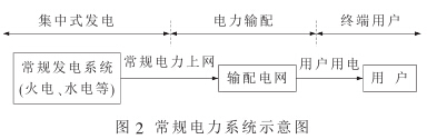 常規(guī)電力系統(tǒng)可簡(jiǎn)化為如圖2所示,系統(tǒng)包括集中式發(fā)電、電力輸配、終端用戶3個(gè)環(huán)節(jié),系統(tǒng)運(yùn)轉(zhuǎn)模式是“即用即發(fā)”,即發(fā)電端根據(jù)用戶端負(fù)荷的變化來調(diào)節(jié)發(fā)電量,此種運(yùn)轉(zhuǎn)模式面臨著非??量痰淖冐?fù)荷要求。