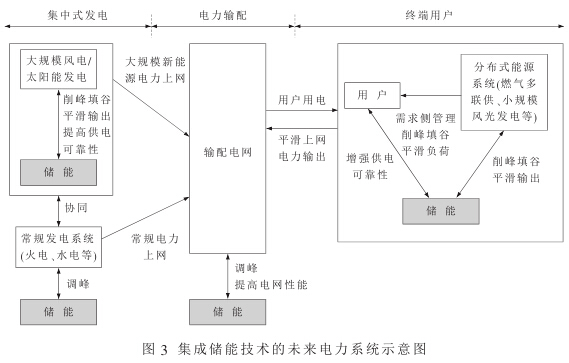 未來的電力系統(tǒng)要包含可再生新能源電力,而新能源電力的大比例接入則會(huì)出現(xiàn)前面提到的潛在問題。如圖3所示,在電力系統(tǒng)中采用集成儲(chǔ)能模塊是解決電力系統(tǒng)變負(fù)荷和新能源電力接入產(chǎn)生問題的有效措施。