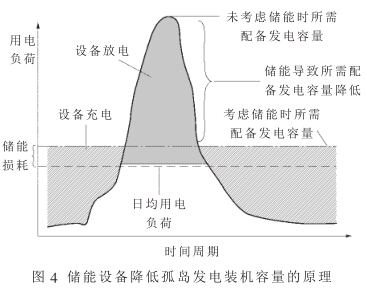 在電力系統(tǒng)中引入儲(chǔ)能模塊,在不同時(shí)間點(diǎn)進(jìn)行電能吞吐,相當(dāng)于在電力系統(tǒng)中添加了一個(gè)可調(diào)節(jié)維度,最終實(shí)現(xiàn)整個(gè)系統(tǒng)的高效、低成本和可靠運(yùn)行。此外,電力儲(chǔ)能在離網(wǎng)孤島終端的使用也是其重要的應(yīng)用場(chǎng)合,通過設(shè)置適當(dāng)規(guī)模的電力儲(chǔ)能裝置,在用電低谷時(shí)充電、用電高峰時(shí)放電,會(huì)降低離網(wǎng)孤島終端所需匹配的發(fā)電能力/容量,同時(shí)使發(fā)電機(jī)組維持運(yùn)行在穩(wěn)定工況,提高整個(gè)系統(tǒng)的能量效率和經(jīng)濟(jì)性能,圖4說明了其原理。