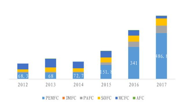 從出貨量來看,由于PEMFC主要應(yīng)用于汽車領(lǐng)域,但下游的幾款主要燃料電池車型短期內(nèi)難以放量,因此17年P(guān)EMFC出貨量基本與16年持平。