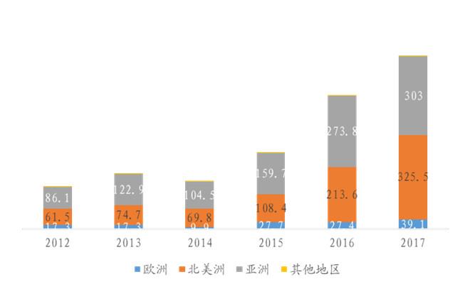 從全球各地區(qū)的出貨兆瓦數(shù)來看,目前北美與亞洲的燃料電池市場呈現(xiàn)分庭抗禮的局面,17年北美的出貨兆瓦數(shù)甚至高于亞洲(北美:325.5MW vs 亞洲:303MW)。