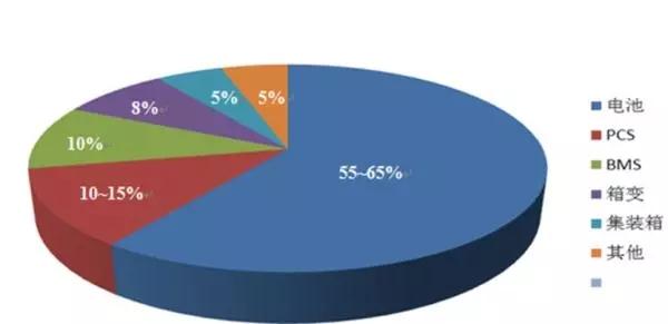 儲能系統(tǒng)的構(gòu)成主要包括電池單元,電池管理系統(tǒng)(BMS)、能量轉(zhuǎn)換系統(tǒng)(PCS),中央控制系統(tǒng)。儲能系統(tǒng)由儲能變流器(PCS)、蓄電池儲能單元、蓄電池管理系統(tǒng)(BMS)和預裝式集裝箱組成。各單元投資比例如圖1: