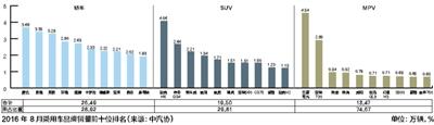 2016年1-8月,中國品牌汽車銷量前十名企業(yè)集團依次為:上汽、長安、東風(fēng)、北汽、長城、江淮、吉利、奇瑞、華晨、一汽;中國品牌乘用車銷量前十名企業(yè)集團依次為:上汽、長安、東風(fēng)、長城、北汽、吉利、奇瑞、比亞迪、廣汽、江淮。