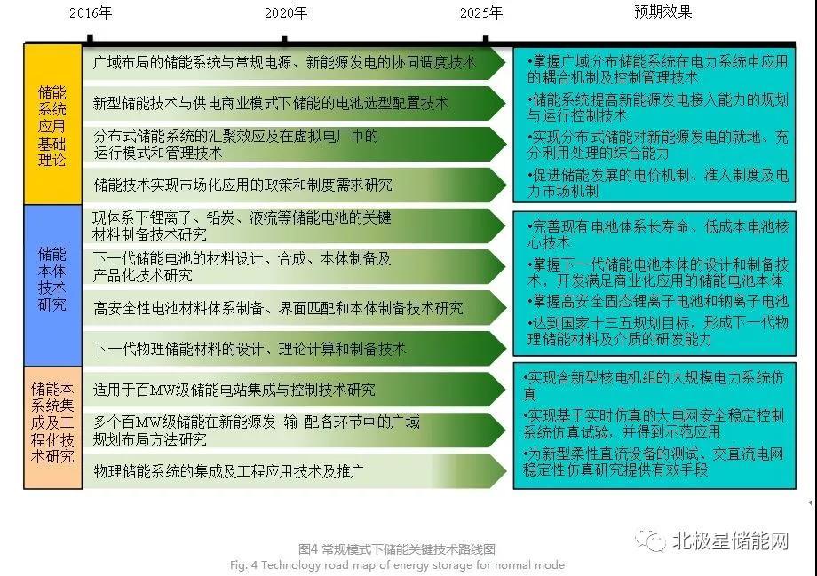 如圖4所示,常規(guī)模式技術(shù)路線下,全面掌握戰(zhàn)略布局的先進(jìn)儲能技術(shù),重點(diǎn)攻關(guān)化學(xué)儲能、壓縮空氣儲能、高溫儲熱的材料制備和核心裝置制造技術(shù)。突破儲能系統(tǒng)集成和能量管理等關(guān)鍵技術(shù),實(shí)現(xiàn)不同場景不同規(guī)模的示范驗證和推廣應(yīng)用。構(gòu)建完備的儲能技術(shù)標(biāo)準(zhǔn)體系,形成相對完善的產(chǎn)業(yè)鏈結(jié)構(gòu)。