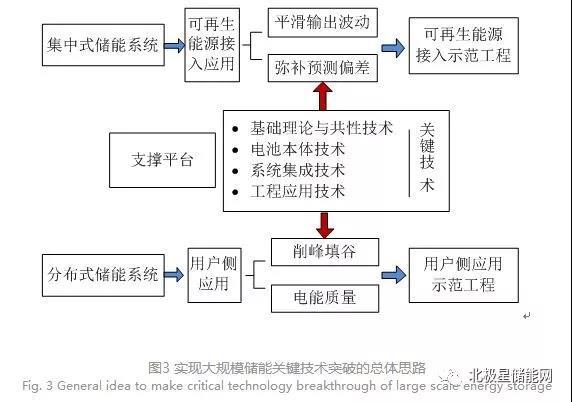 第3階段(2040—2050年)是全面推廣應(yīng)用階段。電化學(xué)儲能、壓縮空氣、熱相變和儲氫等不同類型的大容量電網(wǎng)儲能技術(shù)得到推廣應(yīng)用。高比能電動汽車移動式鋰空氣儲能、家庭分散儲能裝置等實(shí)現(xiàn)“即插即用”。實(shí)現(xiàn)多種儲能方式的協(xié)調(diào)互補(bǔ)和統(tǒng)一規(guī)劃調(diào)控。大規(guī)模儲能關(guān)鍵技術(shù)突破的總體思路見圖3。