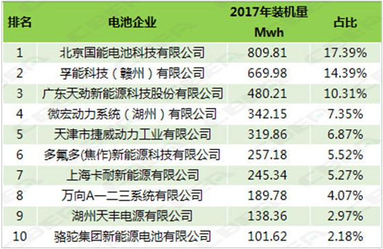 圖2:2017年純電動汽車軟包動力電池裝機量排名統(tǒng)計