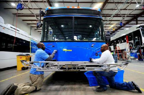 5月1日,在位于美國加州洛杉磯縣蘭開斯特市的比亞迪工廠,工人在總裝車間工作。