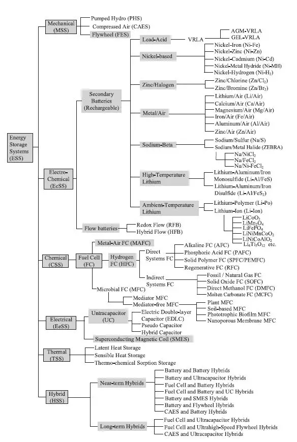 圖3根據(jù)它們的結(jié)構(gòu)形式和材料成分劃分的儲能系統(tǒng)分類(ESS)。
