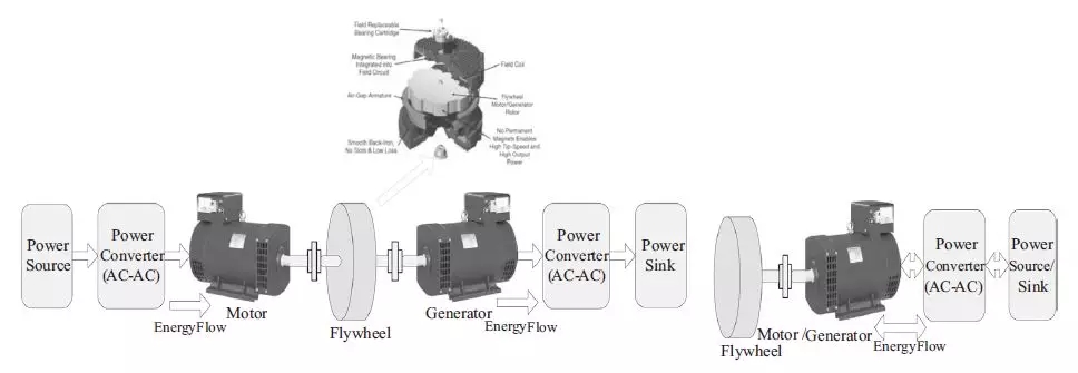由于電力電子和材料工程的進步,飛輪儲能系統(tǒng)(FES)適用于電動汽車和動力系統(tǒng)[36]。能量效率在90-95%和功率規(guī)模0-50 MW [36 - 43] 。飛輪系統(tǒng)包括在腔室中旋轉(zhuǎn)的圓柱形本體,聯(lián)接軸承,以及能量傳遞裝置,發(fā)電機/電動機一起安裝在一個共同的軸上[15,30,36,37] 。保持飛輪不斷旋轉(zhuǎn)的能量被轉(zhuǎn)換成推動傳動裝置的電能。