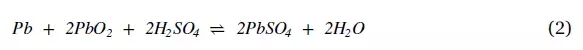 3.2.2.1 鉛酸電池。自1860年以來,鉛酸電池一直被用作商業(yè)能源 [45]。LA電池常見的用法是每臺內(nèi)燃機(ICE)車輛起動電源,由于其堅固耐用,運行安全,溫度耐受性好和低成本,通常可用于應(yīng)急電源,可再生能源儲存和電網(wǎng)調(diào)峰 [15,30]。電池由Pb作為負極,PbO2 作為正極,H2SO4 作為電解質(zhì)[14,58]。發(fā)生在LA電池中的電化學(xué)反應(yīng),如方程 (2)。