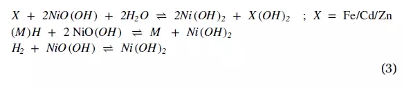 鎳基電池利用氫氧化鎳作為正極,負極材料。根據(jù)有多種。根據(jù)負極材料額種類不同,鎳基電池可以分為:鎳-鐵,鎳-鎘,鎳-鋅,鎳氫,和Ni-H2 [3,14,30,45,62] 。通常,在鎳基電池中,活性材料羥基氧化鎳作為正極,氫氧化鉀作為電解質(zhì),金屬Fe/Cd/Zn,MH或H2 材料作為負極 [14]。發(fā)生在鎳基電池中的整體電化學(xué)反應(yīng)式(3):