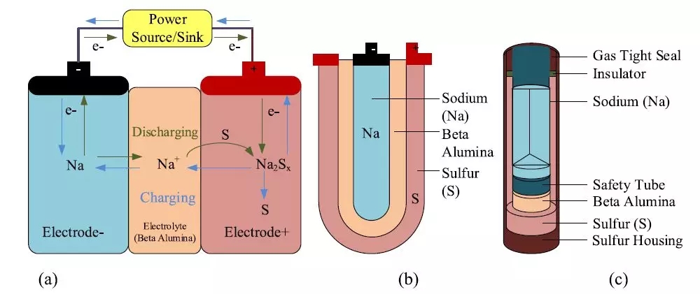 圖 10. 鈉硫電池:( a )在放電和充電過程中,( b ) Na-S 電池的管狀設(shè)計圖,( c ) Na-S 電池原型 [30,33,53,83] 。