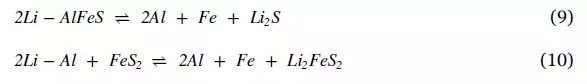 鋰電池有專為高溫環(huán)境應(yīng)用設(shè)計的品類。除了鈉-β電池,鋰-鋁-鐵(鋰-鋁- FES)和鋰-鋁-鐵(鋰-鋁-的FeS2)都是高溫鋰電池[14,45,59]。這些鋰硫電池在所有鋰電池中具有最高的能量容量。但此類鋰電池循環(huán)壽命短[3],需要熱管理,并且由于需要維持工作溫度會造成大量能量損失[14]。鋰硫電池的操作溫度范圍375-500℃ [14,45]。高溫鋰-硫電池由鋰鋁合金作為陽極,鐵硫化物為陰極,熔融的鋰氯化物氯化鉀作為電解質(zhì)和隔膜[14,59] 。在這些電池中,鋰-Al合金被用于控制鋰的活性,和鐵硫化物用于防止鐵的腐蝕[14,59] 。在兩種鋰硫電池類型中,總體電化學(xué)反應(yīng)如方程(9)和(10)所示。