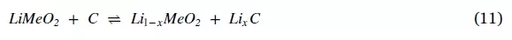 鈷酸鋰電池是被開發(fā)的第一個類型。氧化鈷是比,鎳和錳等元素都要昂貴的元素,后者更具有價格優(yōu)勢 [94] 。LiFePO4 電池功率密度高,并且在所有鋰離子電池中成本最低[3,92]。LiFePO4 電池在熱穩(wěn)定性好,化學(xué)性能穩(wěn)定性好[3],因此能夠廣泛應(yīng)用于電動汽車。由于Li4Ti5O12 電池比其他鋰電池充電更快,在電動汽車中也有應(yīng)用[3]。鋰離子電池由作為陰極的鋰金屬氧化物(LiMeO2,例如LiCoO2,LiMn2O4,LiFePO4,LiNiMnCoO2,LiNiCoAlO2和Li4Ti5O12),有機碳酸鹽作為電解質(zhì),鋰化石墨碳作為陽極,以及隔膜組成[45,65,84,86,94,95]。鋰離子電池的整體電化學(xué)反應(yīng)如式(11)所示。