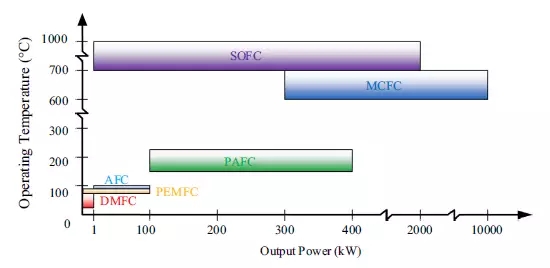 圖15示出了不同類型FC在操作溫度下的各種輸出功率水平[3,100] 。AFC,PEMFC和DMFC在常溫下運行,適用于中低檔電力存儲應(yīng)用。PAFC使用中溫FC。這些FC,由于其操作效率高,設(shè)計簡單和低排放而被運用于交通運輸[3,100]。MCFC和SOFC在600 - 1000°C [3,45,100]的高溫下運行。這兩個FC用于大規(guī)模電力存儲,電力公司和電網(wǎng)發(fā)電應(yīng)用。DMFC使用甲醇(CH3OH)直接作為燃料,因為它比氫更容易儲存[53]。DMFC是一種高能量密度的FC,但其電效率低,并且排放CO2[53]。SOFC具有較高的燃料效率,比DMFC更好的穩(wěn)定性,但它是昂貴的,需要高溫。由于發(fā)電效率比較高,SOFC作為一個潛在的輔助電源被用于EV上,因為它們的高電子商務(wù)效率 [53,101 - 103] 。