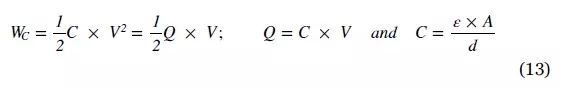其中WC 是靜電能量,C是UC的電容值,V是電極兩端的電壓,Q是電荷,ε是介電材料的介電常數(shù),A是電極的表面積,d是電極。