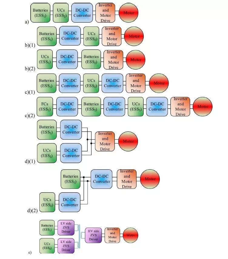 圖18. HSS的結(jié)構(gòu):a)兩個并聯(lián)的ESS(無源),b)一個串聯(lián)的雙向DC-DC轉(zhuǎn)換器; c)兩個串聯(lián)的雙向DC-DC轉(zhuǎn)換器,d)兩個并聯(lián)的兩個雙向DC-DC轉(zhuǎn)換器,以及e)多輸入ZVS雙向DC-DC轉(zhuǎn)換器。