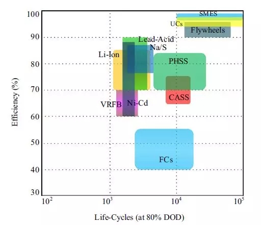 循環(huán)壽命是指ESS的耐久性,取決于ESS可以充電后提供能量的次數(shù)。循環(huán)壽命取決于構(gòu)成ESS的材料和操作水平。效率指的是ESS從所存儲的能量中輸送的能量的量。ESS可能受到幾個參數(shù)的限制,如自放電,循環(huán)壽命,材料特性,能量轉(zhuǎn)換和工作溫度。ESS的規(guī)模是EV應(yīng)用ESS的關(guān)鍵特征。緊湊的尺寸對應(yīng)于電池效率性能。高能量密度對應(yīng)于小的質(zhì)量和體積。成本與規(guī)模密切相關(guān)。而且,ESS的資本成本包括存儲系統(tǒng)的設(shè)計,材料,包裝,維護,損耗,壽命,因環(huán)境問題的經(jīng)營成本的一部分[4- 8,46] 。