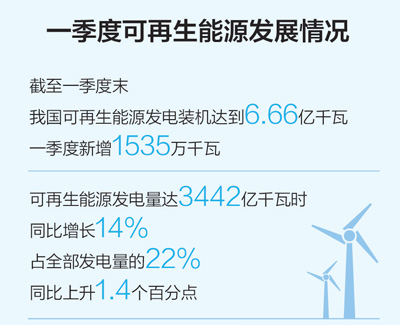 同時,可再生能源利用水平顯著提升。一季度可再生能源發(fā)電量達(dá)3442億千瓦時,同比增長14%;可再生能源發(fā)電量占全部發(fā)電量的22%,同比上升1.4個百分點(diǎn)。“三棄”問題有效緩解:全國基本無棄水;棄風(fēng)電量91億千瓦時,棄風(fēng)率8.5%,同比下降8個百分點(diǎn);棄光電量16.2億千瓦時,棄光率4.3%,同比下降5.4個百分點(diǎn)。