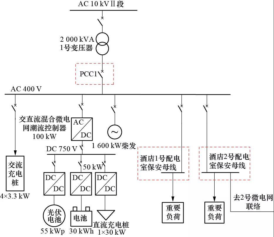 1號(hào)微電網(wǎng)接線如圖5所示,1號(hào)微電網(wǎng)采用交、直流混合供電方式,接入配電網(wǎng)的公共連接點(diǎn)(point of common coupling,PCC)為PCC1,交流電壓400?V,直流電壓750?V,光伏發(fā)電(55?kW)、儲(chǔ)能(50?kW,30?kWh)、直流充電樁(30?kW)經(jīng)過(guò)DC/DC變換器接入直流微電網(wǎng),直流微電網(wǎng)通過(guò)交直流混合微電網(wǎng)潮流控制器(hybrid microgrid flow conditioner,HMFC)與交流微電網(wǎng)連接,實(shí)現(xiàn)交流微電網(wǎng)和直流微電網(wǎng)的混聯(lián),另外4臺(tái)7?kW交流充電樁接入1號(hào)微電網(wǎng)。