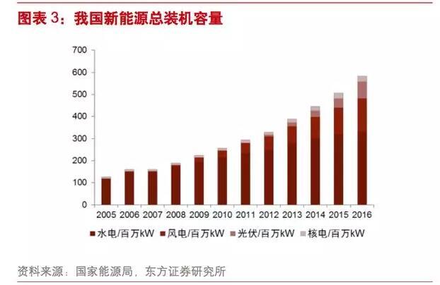 2016 年可再生能源總裝機容量達到 584GW(含水電,其中風(fēng)電、光伏及核電合計裝機量 252GW),2005 至 2016年可再生能源總裝機量 CAGR 達到 15%(其中風(fēng)電、光伏及核電等新能源裝機容量 CAGR 為 34%)。